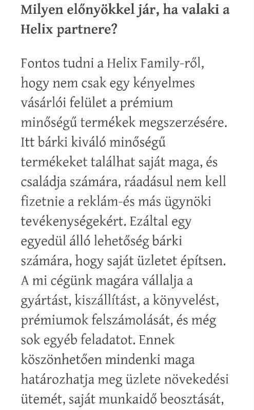 A cég biztosítja lehetőséget a befektetőknek és tagoknak, hogy a Helix-nél dolgozzanak az összes iparágában. Legális foglalkoztatás, teljes körű támogatás. Közvetlen értékesítő munkatársak jelntkezését is várják. További információ a Kapcsolat menüpontban kérhető.